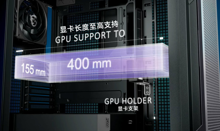 除了主板兼容性之外,机箱在硬件扩展性上也做到了面面俱到,内置可调节显卡支架是其一大亮点,随着高端显卡的体积和重量不断增加,长期使用容易出现显卡下垂、PCB板变形等问题,而这款机箱自带的两段可调节显卡支架,可根据显卡尺寸灵活调节高度,完美支撑显卡重量,有效避免显卡下垂,保护硬件安全,同时支架安装后可完全隐藏,不影响机箱内部美观度,兼顾实用性与观赏性。此外,机箱还支持最长400mm的显卡安装,兼容市面上绝大多数高端独立显卡,包括即将推出的RTX 50系列显卡,满足高端玩家的极致性能需求。