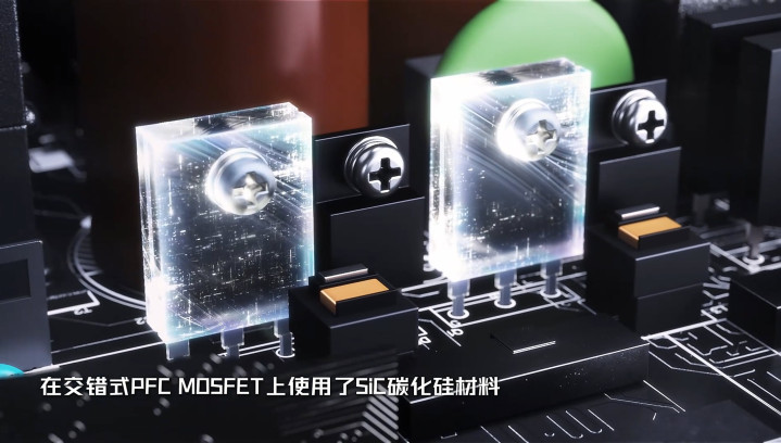 微星MEG Ai1600T PCIE5电源最引人瞩目的亮点,便是其顶尖的硬件配置和创新技术,其中AI碳化硅(SiC)MOSFET技术的应用,更是让这款电源的性能实现了质的飞跃。与传统MOSFET相比,碳化硅MOSFET具有耐高温、低损耗、高效率的优势,这款电源首度将伺服器级别的碳化硅材料应用于交错式PFC MOSFET中,有效增强了电源的稳定性,提升了整体转换效率,减少了电能损耗,同时优化了散热效果,让电源在高负载运行时依旧能保持稳定性能。
